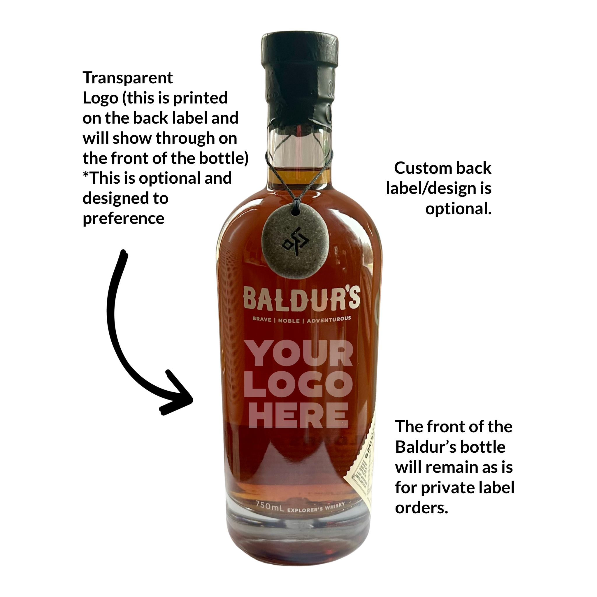 Customization for Baldur’s Whisky Private Release bottles is available on the back label only. We can include a transparent logo on the reverse side so it shows beautifully through the liquid. The front label remains unchanged.